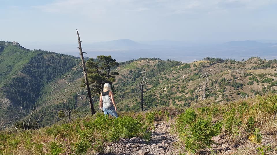 Clouds were getting dark again. It looked like rain. We had hiked just under four miles on this trail and had had enough of heat and sun. Time to call it quits. I washed my hair at a water pump at a campsite across the road from the TJ Corral, and drove back toward Silver City.