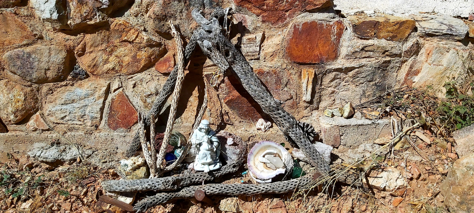 The walk up Brewery Gulch was fun, as always. I always like the artsy homes and decorated gardens.The dogs were on leash here, getting tangled up in each other's leashes, but once we were up in Zacatecas Canyon, all three dogs did very well off-leash.
